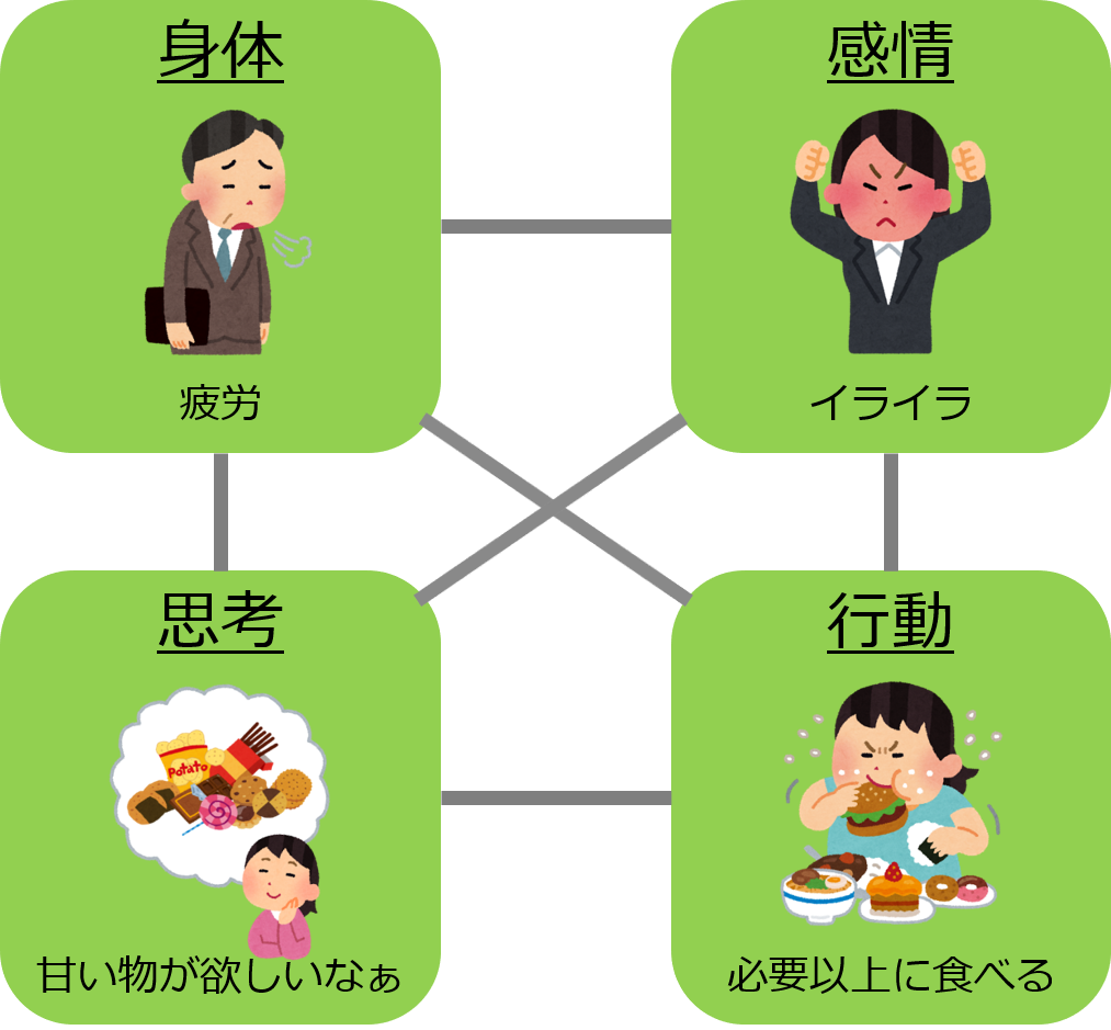 「身体」の状態や「感情」をすぐに変えることは難しいですが、「考え方」や「行動」は少し工夫したり、選んだりすることが出来ます。