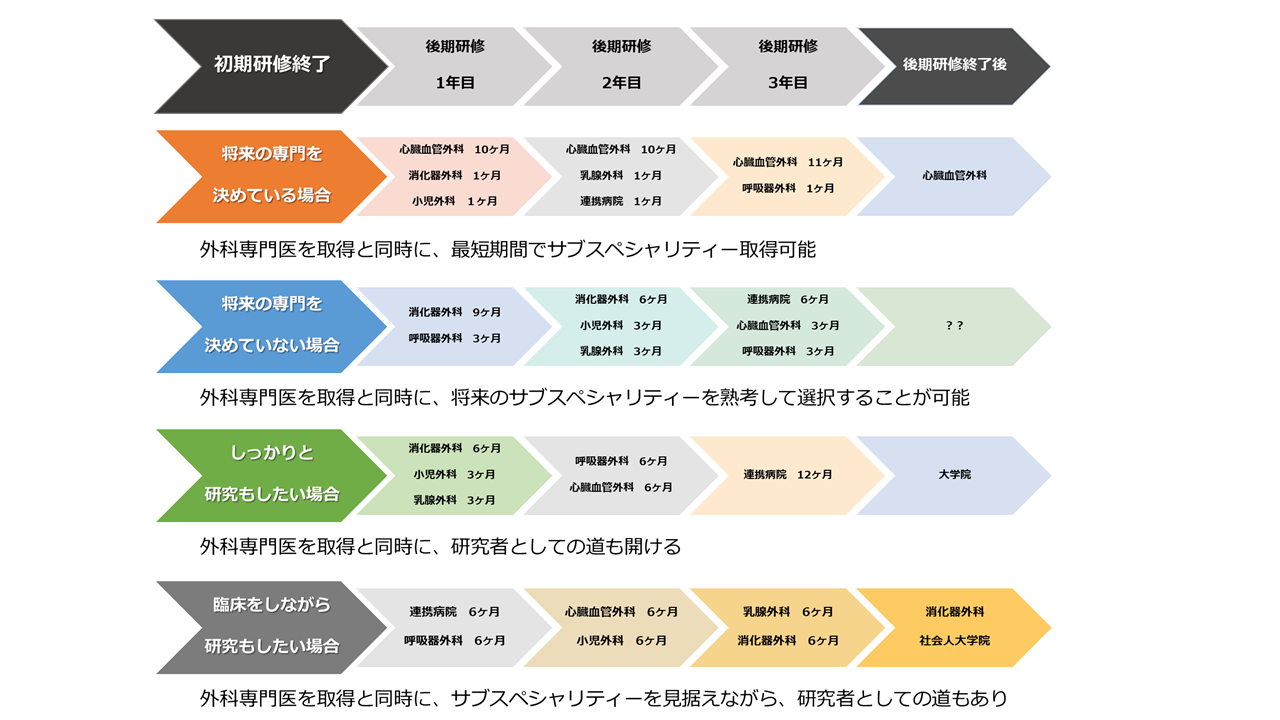 外科サブスペシャリティーの全領域で初期研修終了後から症例登録が可能となります。関西医科大学ではサブスペシャリティーの専門医取得を念頭に置いた指導を行います。